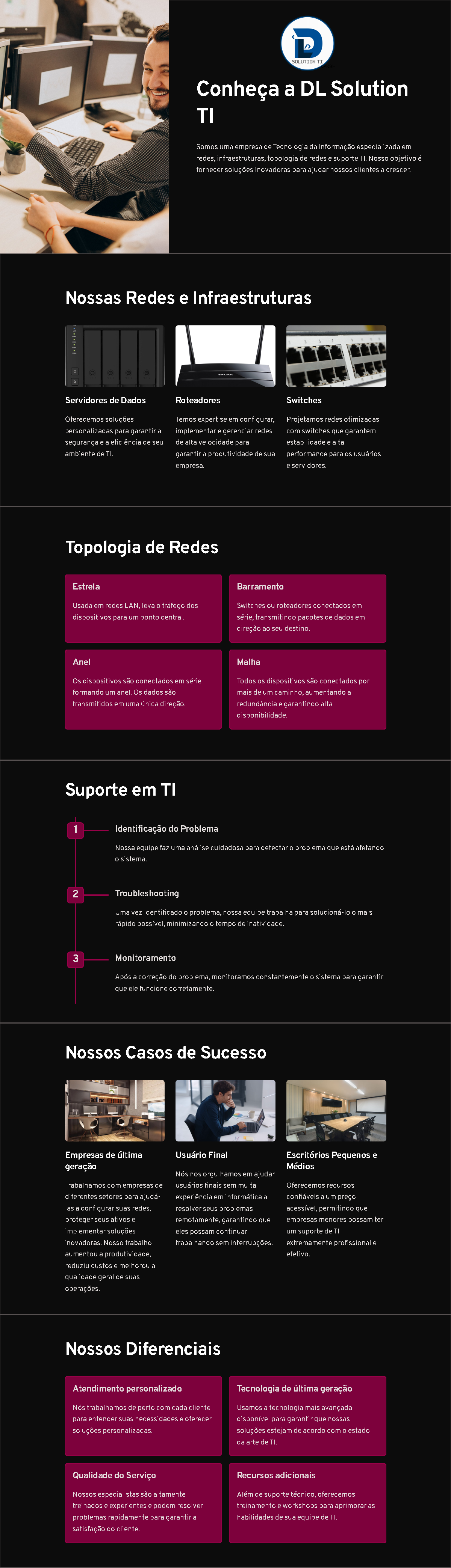 A DL Solution TI oferece suporte técnico abrangente para empresas e indivíduos que necessitam de assistência com problemas relacionados a hardware, software e redes de computadores.