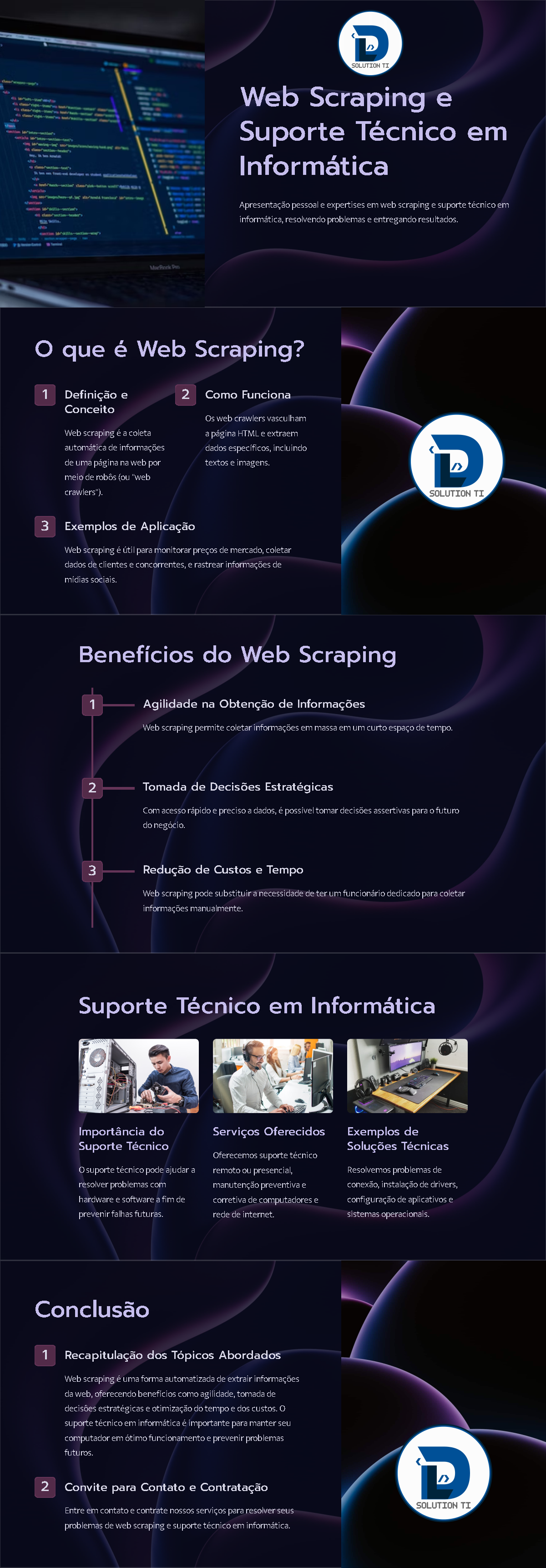 A DL Solution TI é uma empresa de destaque no setor de tecnologia da informação (TI) que se destaca por sua ampla gama de serviços e seu compromisso inabalável em fornecer soluções de alta qualidade para seus clientes. Com uma equipe de especialistas altamente qualificados, a empresa se dedica a atender às diversas necessidades de TI de empresas e indivíduos. DL Solution TI é uma empresa altamente versátil e comprometida que se destaca no campo de TI, oferecendo suporte técnico abrangente, automação de processos, web scraping, BI e consultoria de melhoria de TI. Sua abordagem centrada no cliente e sua experiência em uma ampla variedade de serviços tornam-na uma escolha valiosa para empresas que buscam otimizar seus sistemas de TI, automatizar processos, obter insights valiosos e alcançar o sucesso em um ambiente cada vez mais digital. Se você está procurando parceiros confiáveis em TI, a DL Solution TI é uma escolha sólida e pronta para atender às suas necessidades específicas. Não hesite em entrar em contato com eles para saber como podem impulsionar seus objetivos de TI e apoiar o crescimento do seu negócio.
