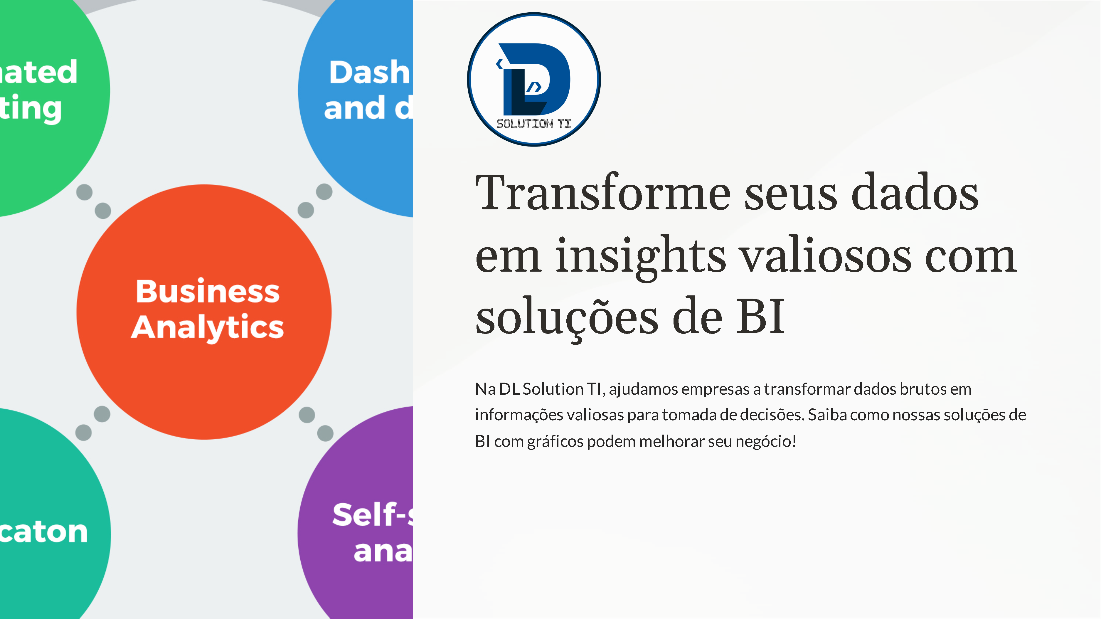 Serviços de Business Intelligence (BI), que é uma área fundamental para empresas que desejam tomar decisões informadas com base em dados. A empresa pode ajudar seus clientes a coletar, analisar e visualizar dados de suas operações comerciais, transformando informações brutas em insights valiosos.